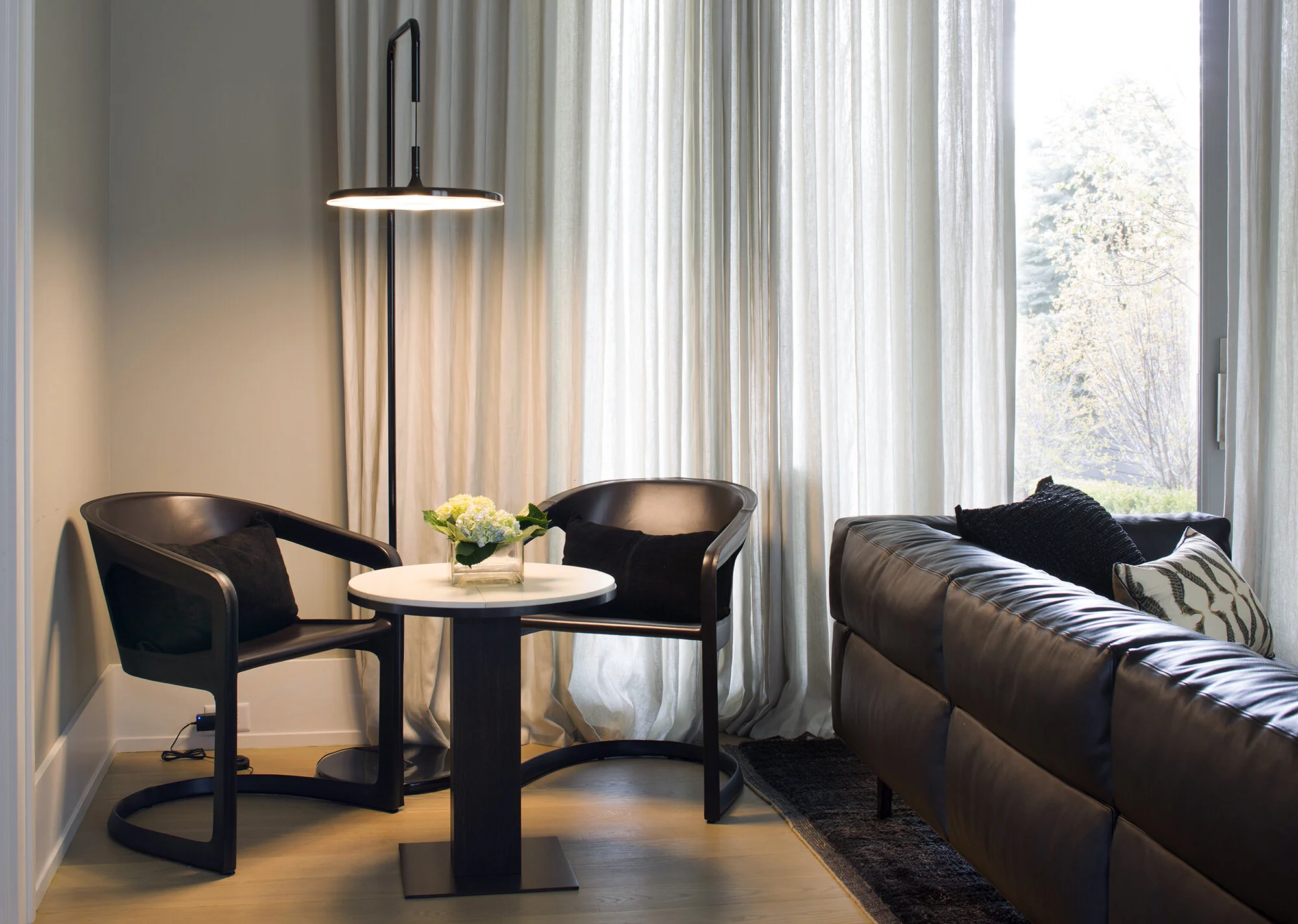 In order to make this recently built well designed home in beautiful Boulder, a more modern vacation retreat, it was furnished with comfortable clean lined furniture and artwork, all with a slight edge so as not to leave the owners' urban selves totally behind. Blacks, whites and neutrals provide a strong and welcoming contrast to the lush outdoors.This melding of city and country continued as a critical focus was building out an office that could serve as a trade center, a meeting space and chill zone. The relax mentality, however, took over stylishly in the design and furnishing of the pool and pool house.